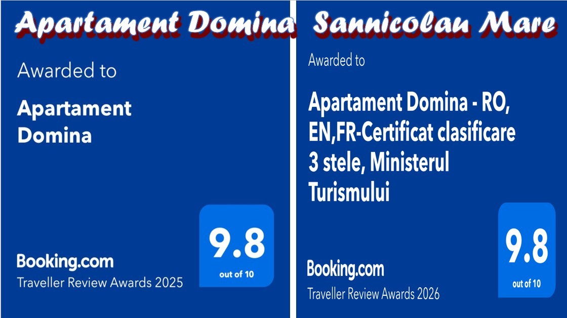 Apartament Domina se află într-o zonă liniștită din Sînnicolau Mare, pe o stradă cu trafic redus. Clasificate cu 3 stele de Ministerul Turismului, apartamentele noastre sunt ideale pentru o persoana,cupluri sau familii cu copii.